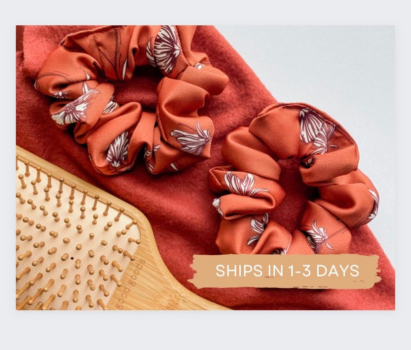 Red Clay Floral Satin Scrunchie: Elegant Hair Accessory