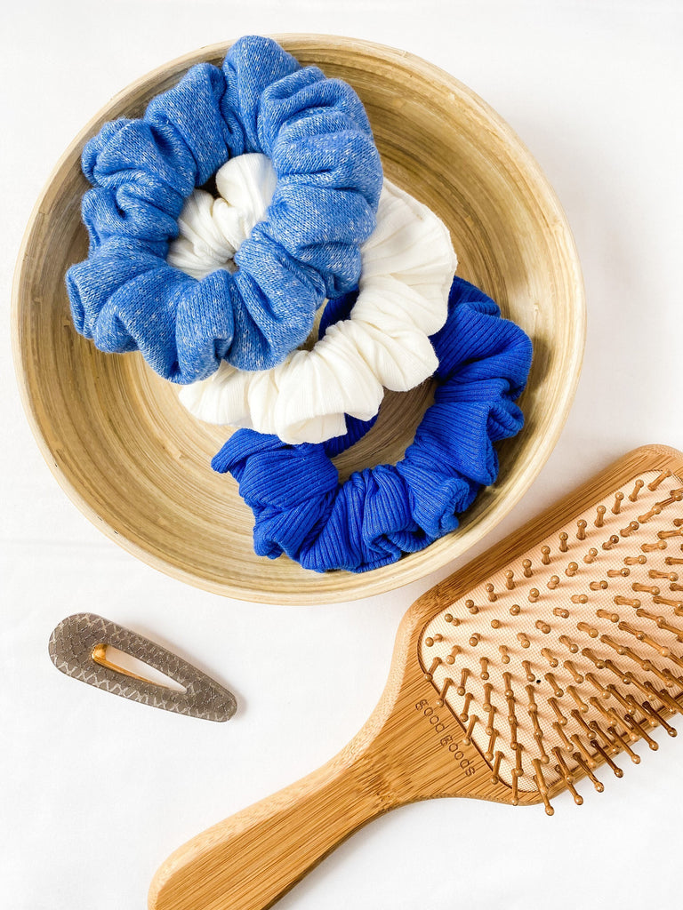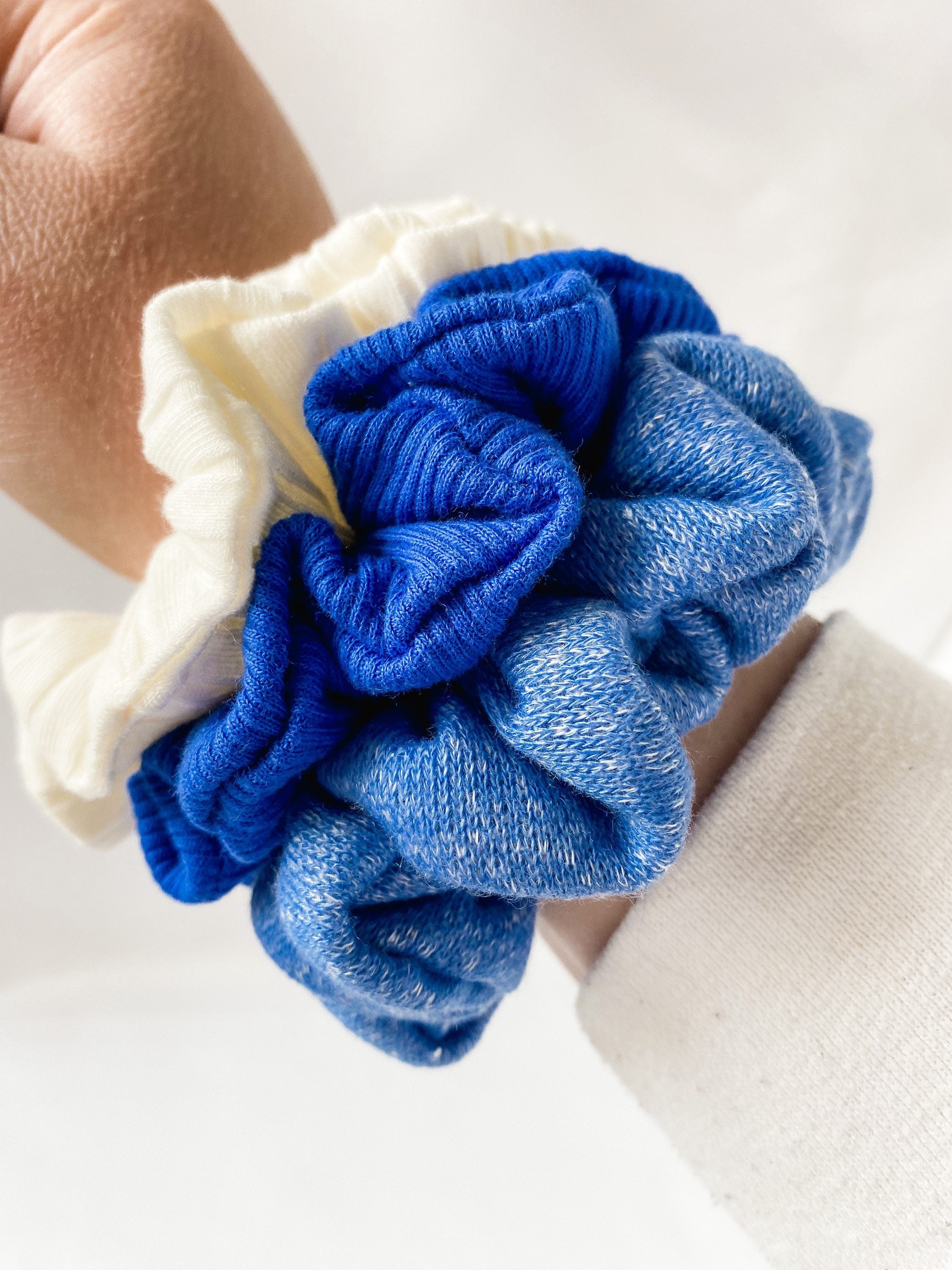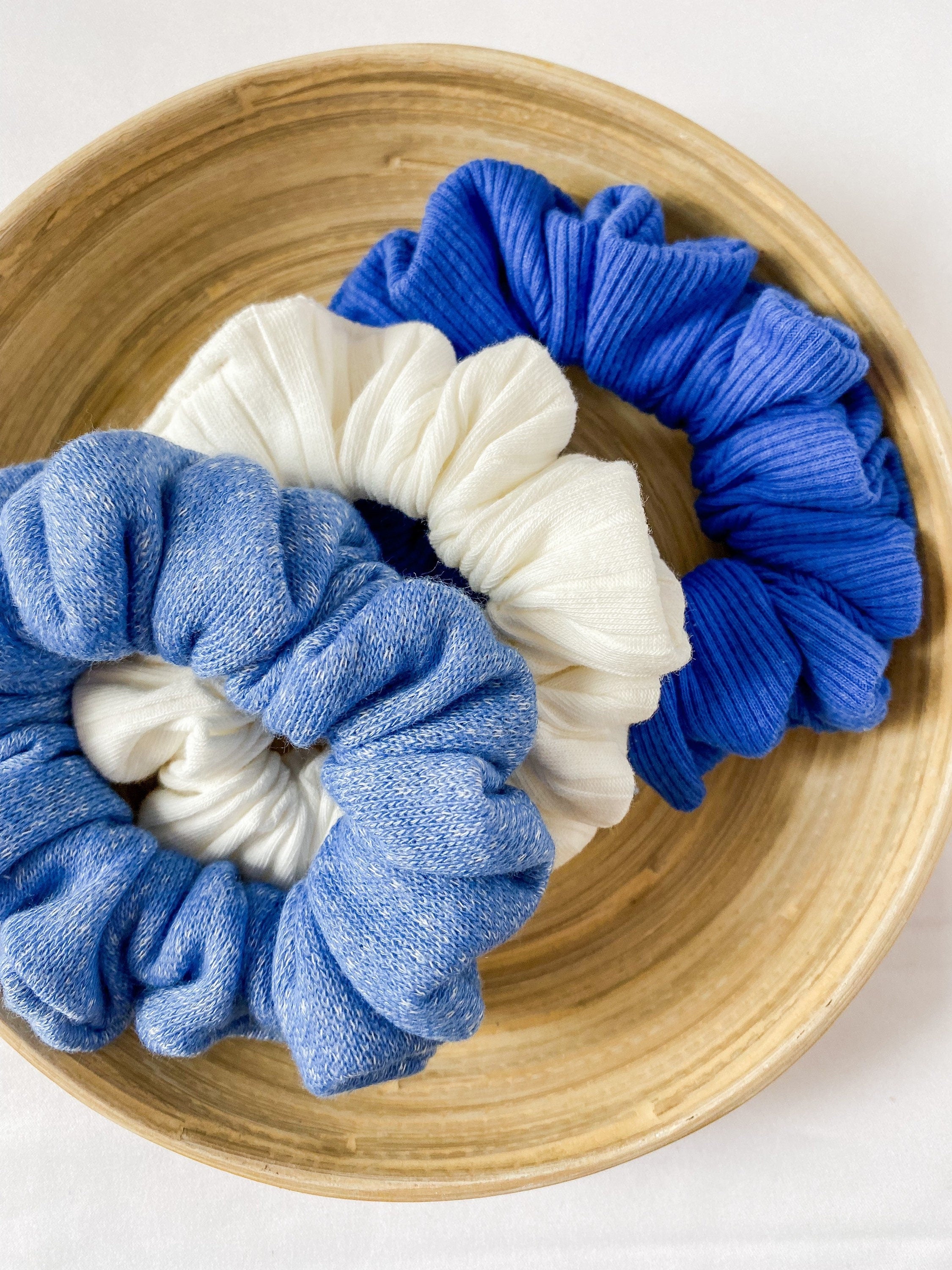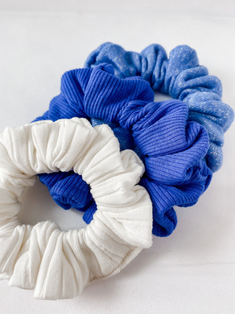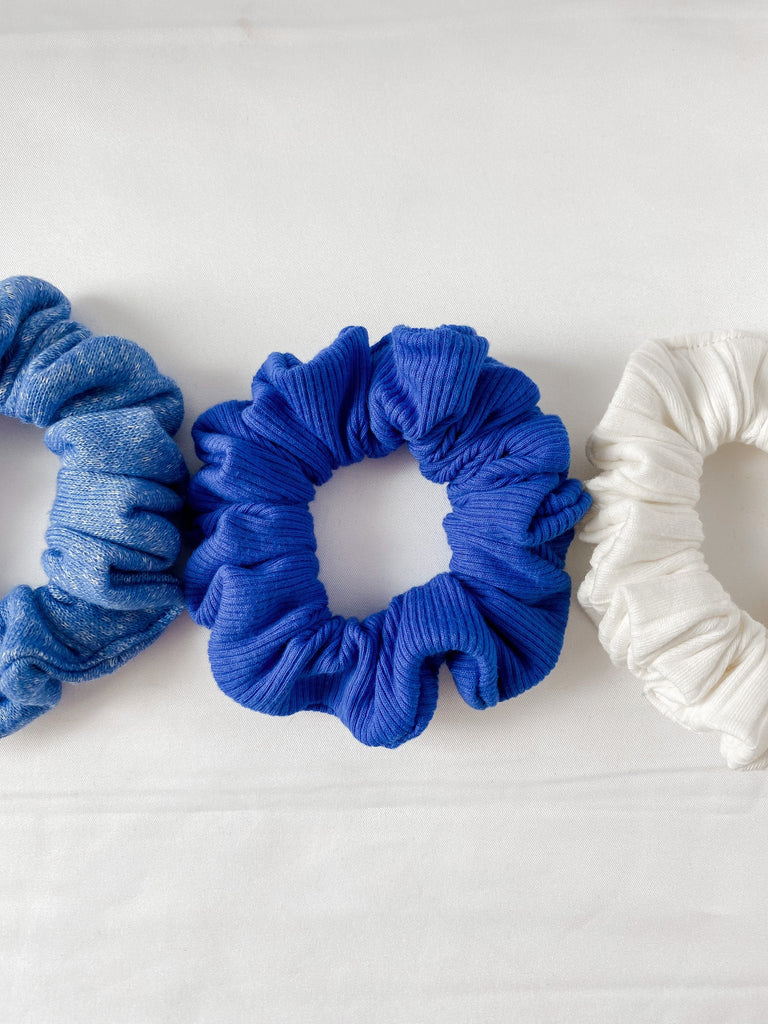 *Comes as a set: one Heather blue French Terry scrunchie, one White wide-rib scrunchie, one Royal Blue rib knit scrunchie.