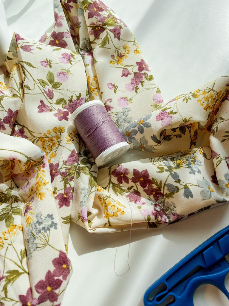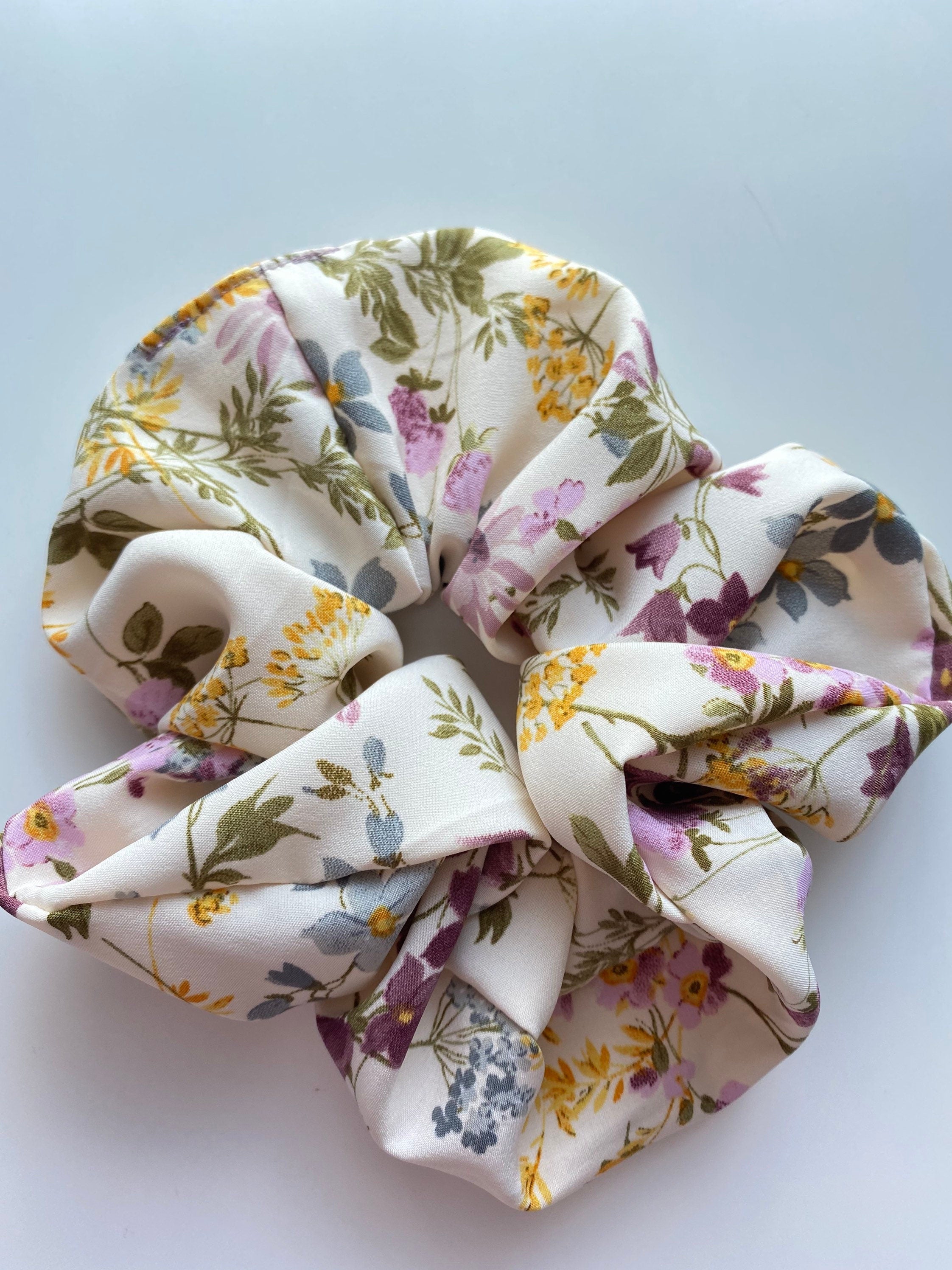 Hello! I am hand washable (spot clean only) and should be air dried! I am a chiffon fabric, made from silky smooth drapey fabric, and a cream color, with purple, yellow, blue, and green vintage florals. I am so so soft and stretchy, but will still keep your hair in place all day!