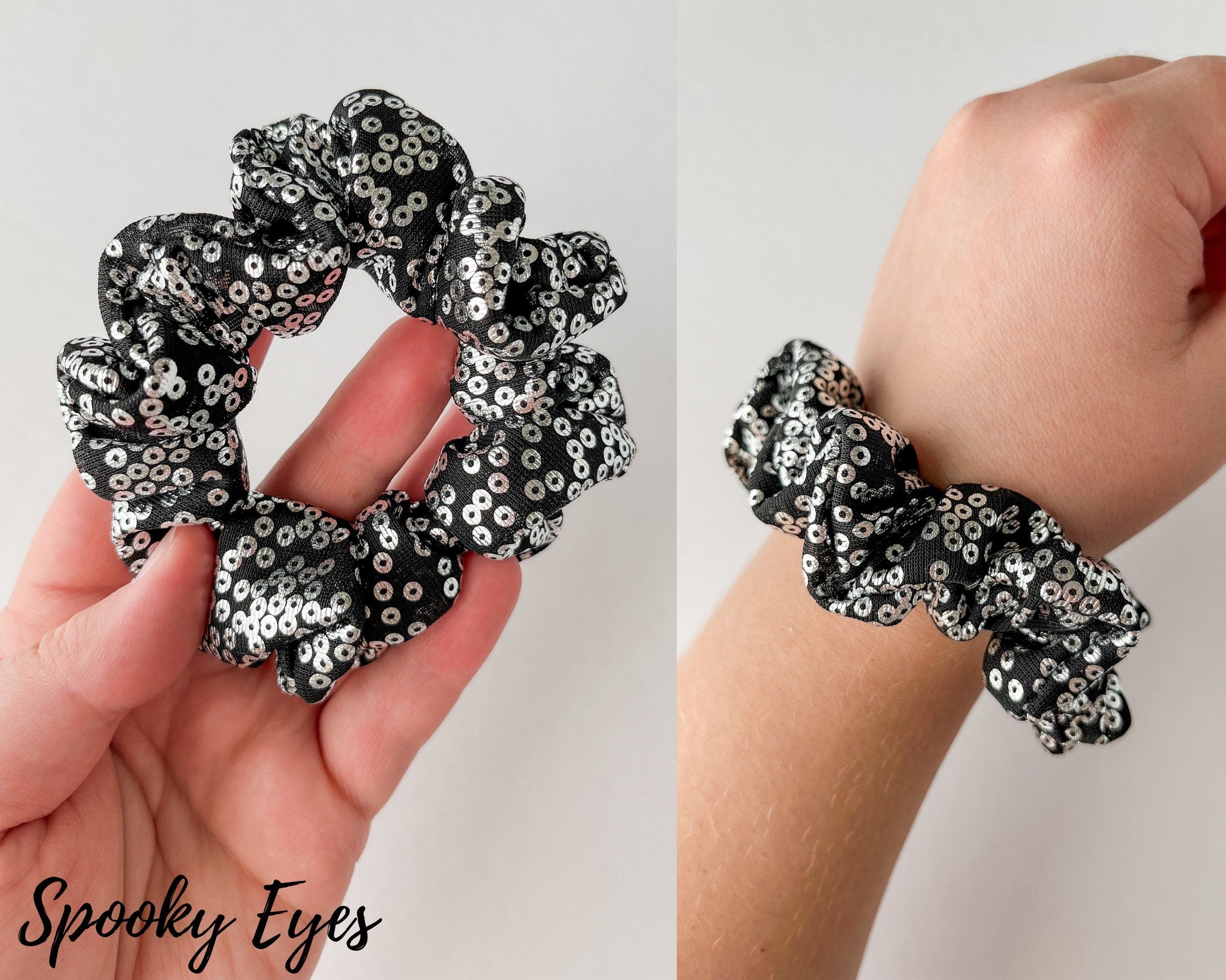 —black Silver sequin SPOOKY EYES scrunchie. Not made from actual sequins, they are printed on.