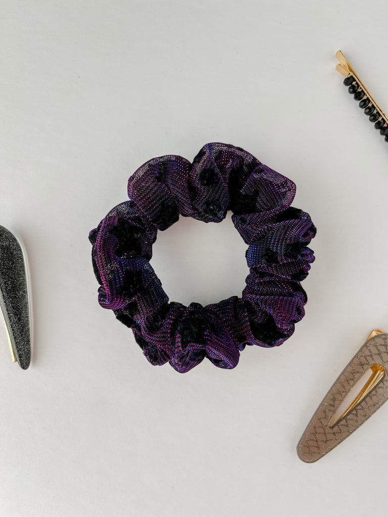 —iridescent purply COSMOS scrunchie, which has black velvet stars.